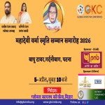 ग्लोबल कायस्थ कॉन्फ्रेंस (GKC) द्वारा हिंदी साहित्य की महान विभूति और छायावाद युग की प्रमुख स्तंभ महादेवी वर्मा जी की स्मृति में “महादेवी वर्मा स्मृति सम्मान समारोह 2026” का भव्य आयोजन आगामी 5 अप्रैल 2026, सुबह 10 बजे बापू टावर, गर्दनीबाग, पटना में किया जा रहा है।